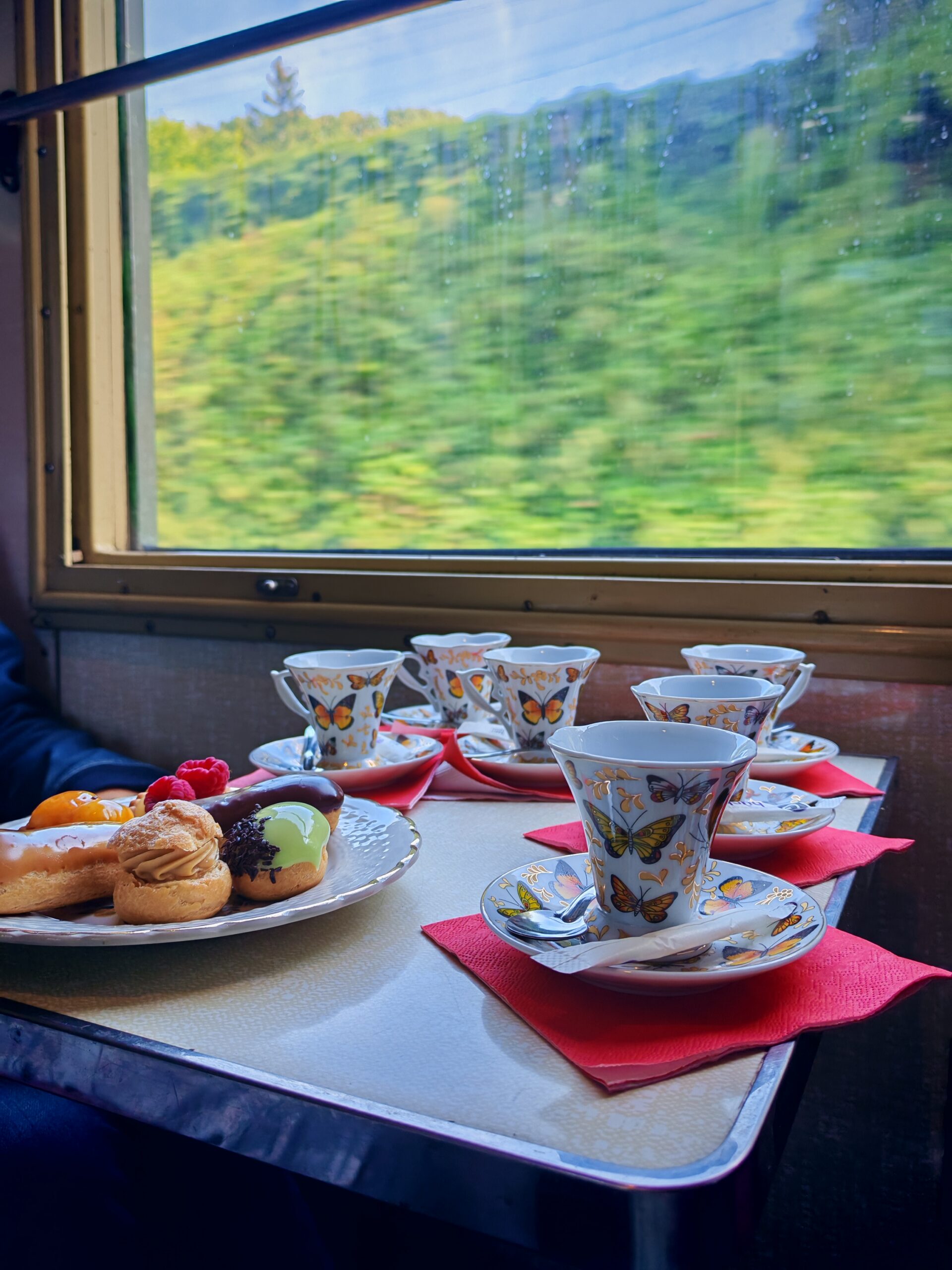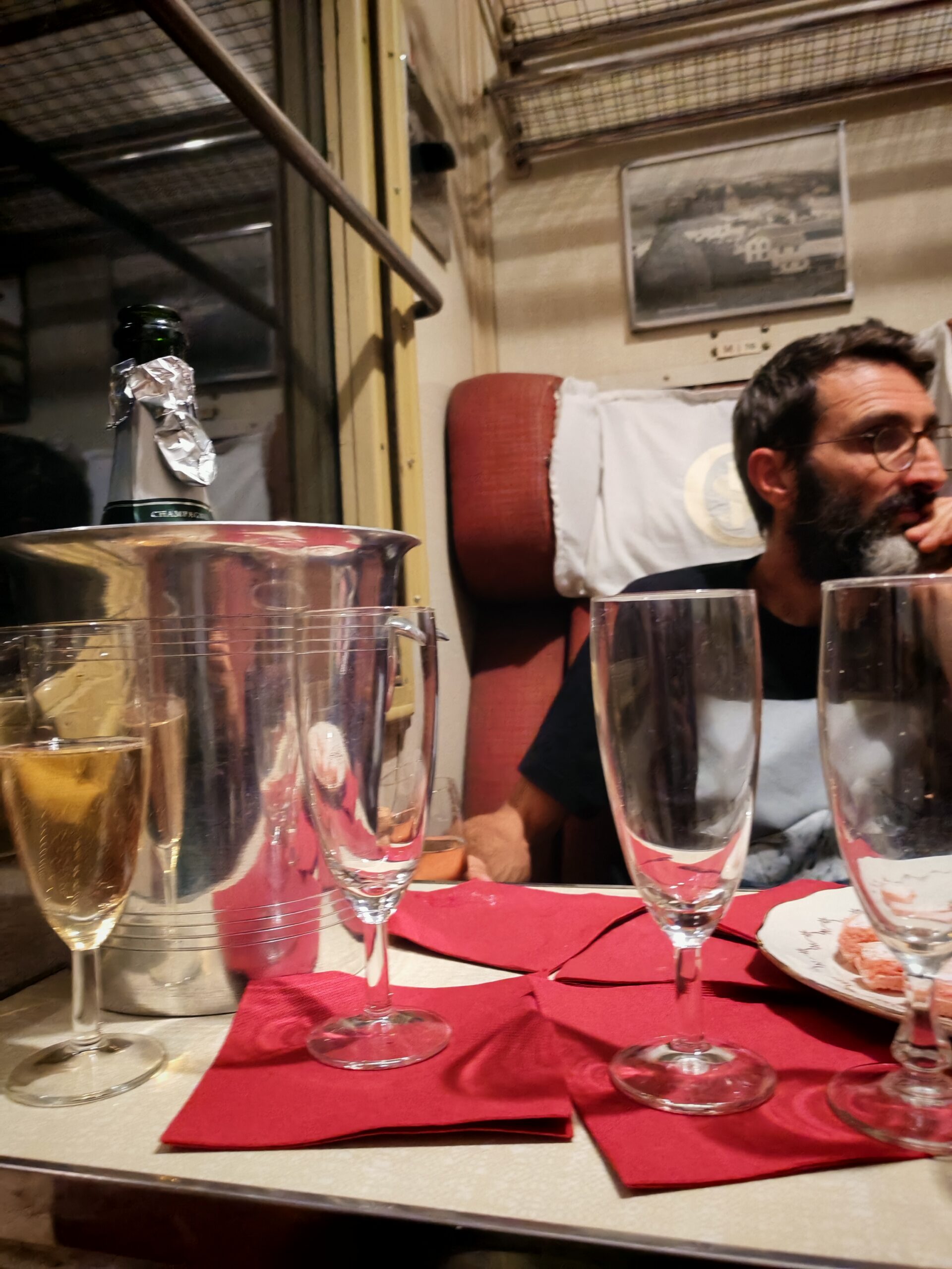 Dès l’embarquement, on se laisse happer par l’ambiance. Les voitures des années 30, les fauteuils de 1ère classe, les luminaires art déco, le mobilier SNCF jusque dans les moindres détails… même les WC d’époque deviennent une curiosité à part entière ! Ça n’avait rien à voir avec les toilettes des trains d’aujourd’hui. Bon… logique mais ça reste toujours surprenant. Chaque objet attire notre regard, chaque détail nous raconte une petite histoire. Et pour parfaire ce tableau les bénévoles sont évidemment pour la plupart en tenues d’époque, tous très souriants et vraiment aux petits soins. Service au siège avec café et mignardises le matin, champagne et séance de cabaret le soir… On n’est pas dans un simple train…C’est une expérience totale et où le voyage est une fête.